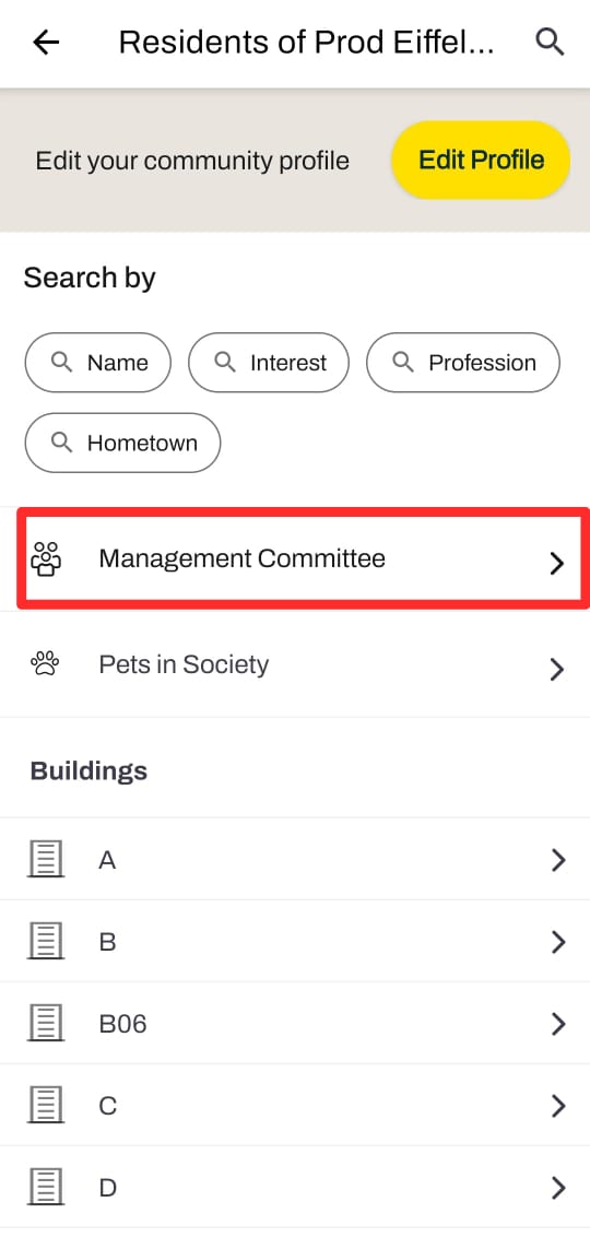 You can view management committee information and contact them through the app by following a specific process to avoid confusion.